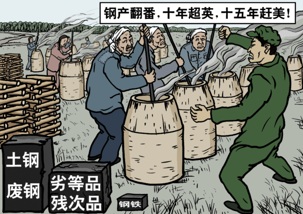 反右之後,中國進入了恐懼事實的狀態。聽假話、說假話、做假事,逃避事實、歪曲事實成為世風。大躍進便是一次全國集體編造謊言的大爆發。人們在共產黨的邪靈引導下,做出了許多荒誕不經的蠢事。說謊者和受騙者同樣自欺欺人。在這場謊言與愚行的鬧劇中,共產黨強制地把它的暴虐邪氣植入了全國人民的精神境界。人們高唱著「我就是玉皇,我就是龍王,喝令三山五嶺開道,我來了」的躍進歌謠,實施著「畝產萬斤,鋼產翻番,十年超英,十五年趕美」的荒誕計劃,轟轟烈烈,經年不醒。直到大饑荒席捲中國,餓殍遍野、民不聊生。